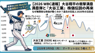 2026年WBC初戦、大谷翔平選手が放った衝撃の満塁ホームラン!劇的な勝利の裏で注目されるのが、前回大会で株価が4倍に跳ね上がった「大谷工業(5939)」の存在です。伝説の再来はあるのか?月曜日の相場展望と大谷選手の活躍を徹底解説します。