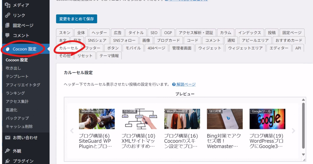 - WordPress管理画面 → サイドバーの「Cocoon設定」→「カルーセル」タブ