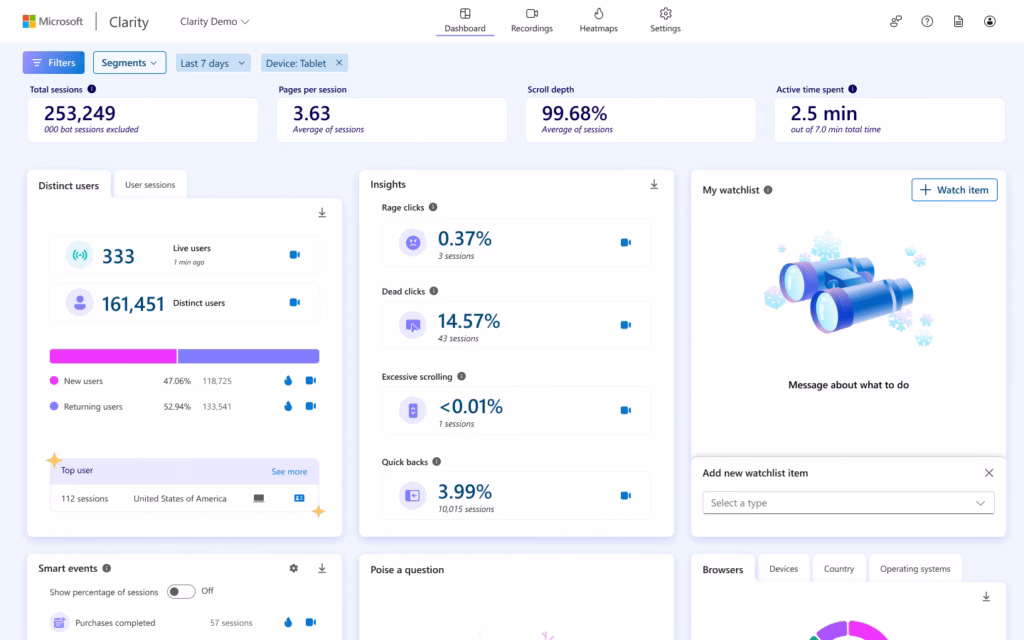 Microsoft Clarityの公式サイトでは、以下のような機能が紹介されています。