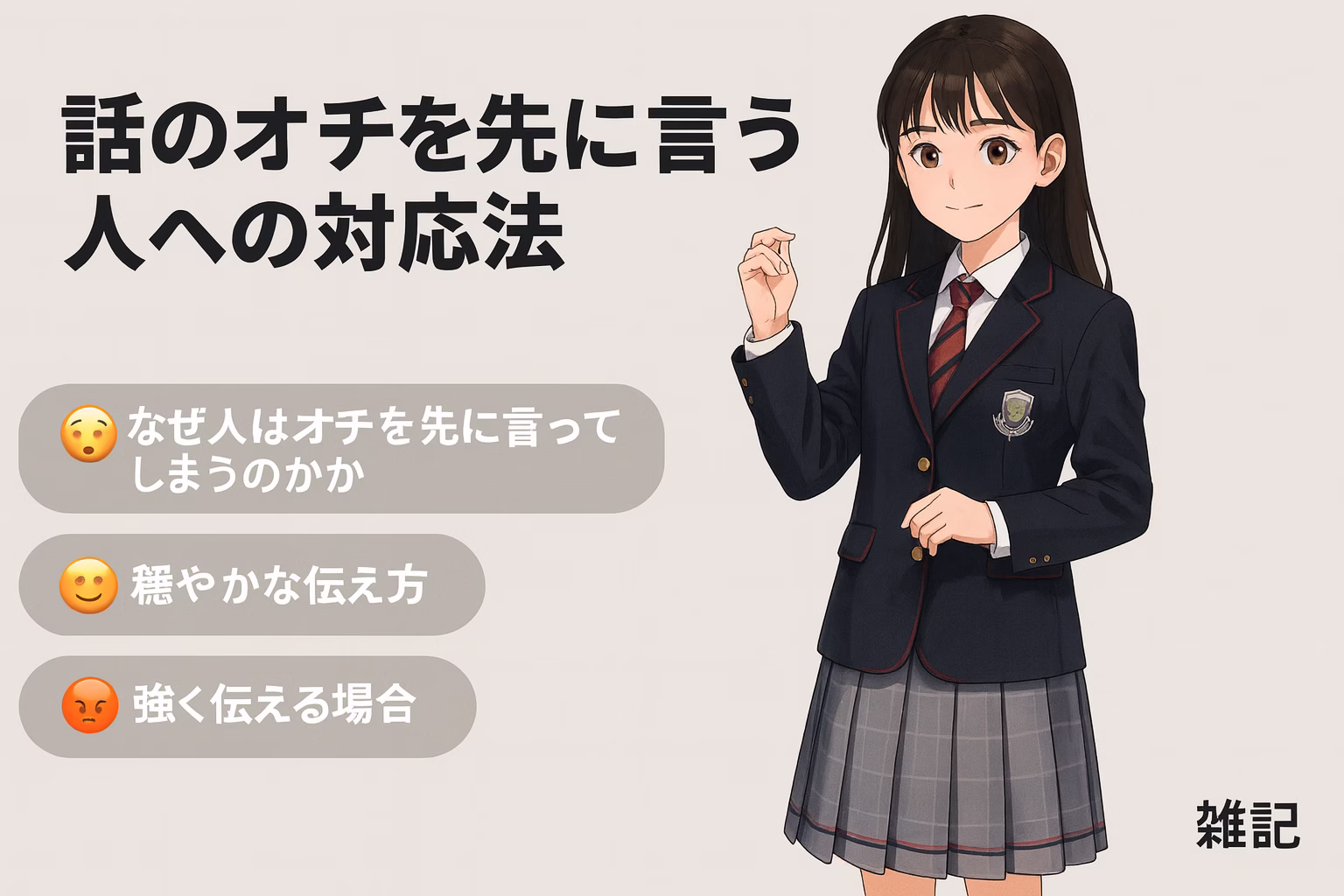 会話の楽しみは、最後まで聞いて余韻を味わうことにあります。しかし、相手がオチを予測して先に口にしてしまうと、不快に感じたり「その発言は不要だ」と思うこともあるでしょう。この記事では、初心者から中級者向けに「話のオチを先に言う人」への心理的背景と、実際に使える対処法をわかりやすく解説します。