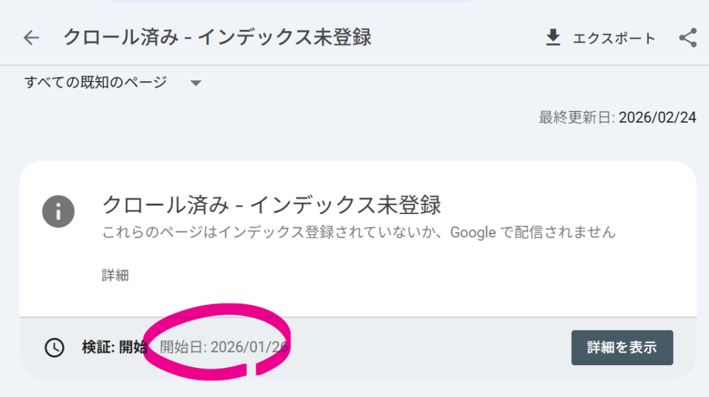 しかも、トップページだけが登録されていて、他はすべて「クロール済み – インデックス未登録」。