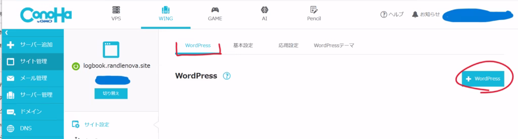 ConoHa WINGのコントロールパネルにログインし、「サイト管理」→WordPressをインストールしたいドメインの「切り替え」ボタンを押します。今回は具体例として当ブログ logbook.randlenova.site に切り替えます。